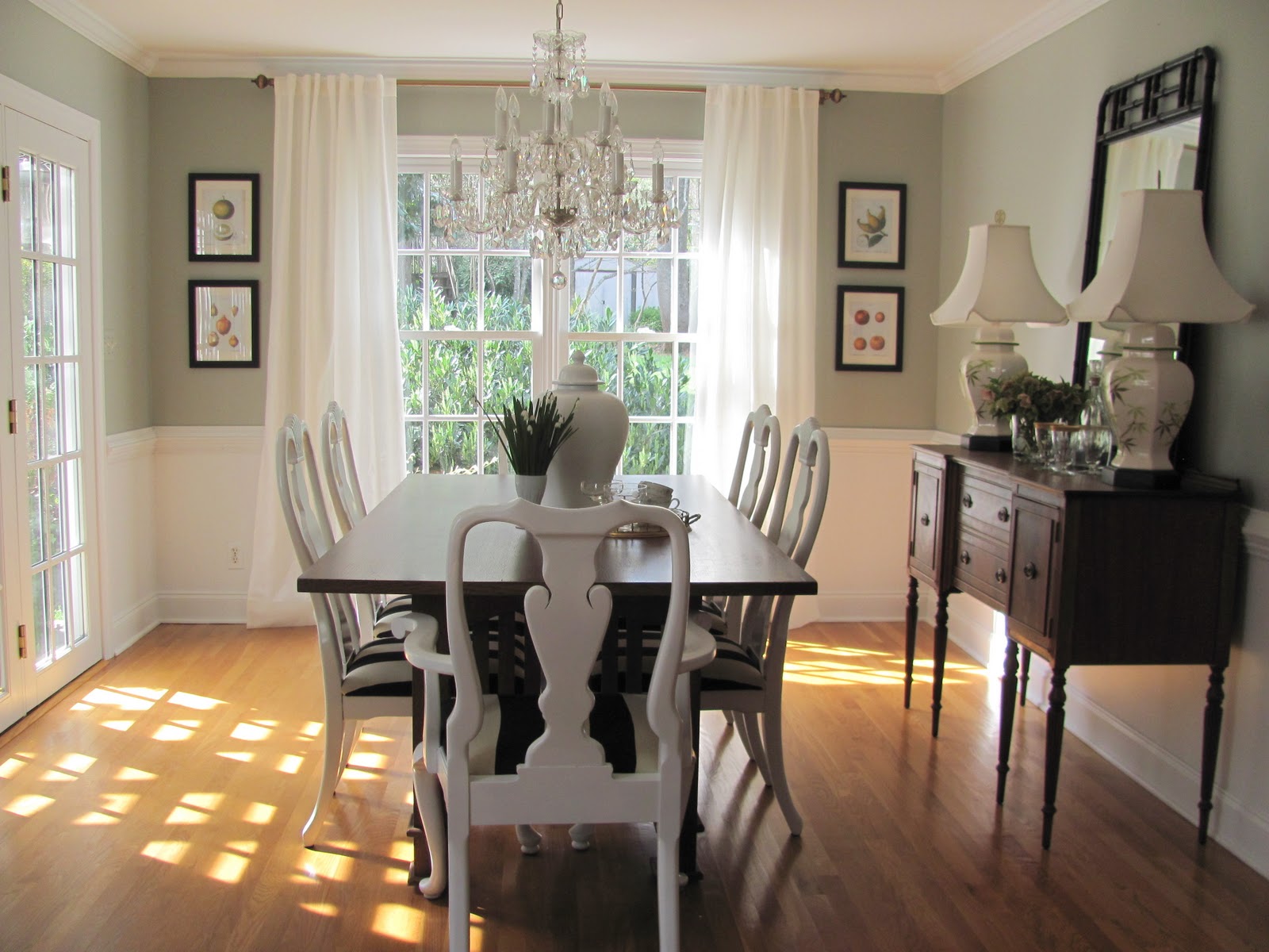 Large living room featuring green walls and white seats. A hue like benjamin moore s white dove is a go to for dining rooms because it s an incredibly versatile and forgiving white that plays wonderfully with a wide variety of colors. If you want to have the formal look the choice of color scheme and dining set should be taken into consideration.