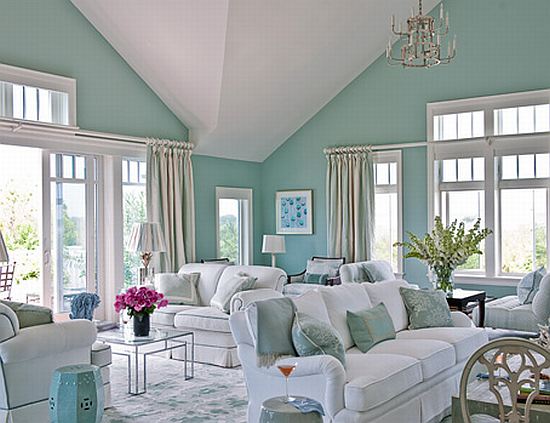 Light blue color allows the light to spread and makes a room look brighter. Large living room featuring green walls and white seats. The room has hardwood flooring topped by an area rug.